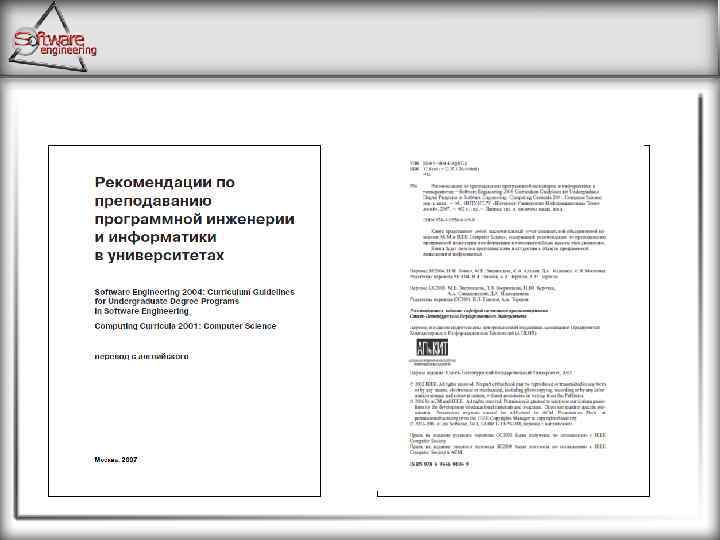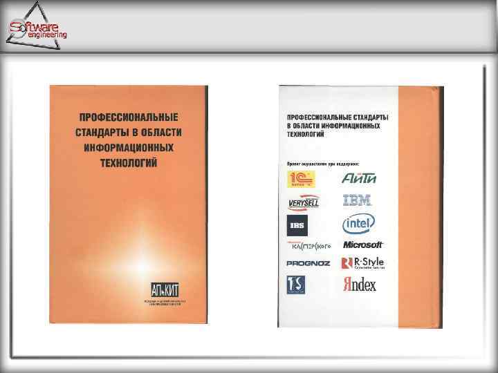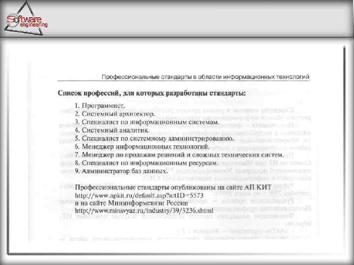 Содержание SWEBOK Десять областей знаний: 1. Требования к программному обеспечению (Software Requirements). 2. Проектирование программного обеспечения (Software Design). 3. Конструирование программного обеспечения (Software Construction). 4. Тестирование программного обеспечения (Software Testing); 5. Сопровождение программного обеспечения (Software Maintenance). 6. Управление конфигурацией программного обеспечения (Software Configuration Management). 7. Управление в программной инженерии (Software Engineering Management). 8. Процесс программной инженерии (Software Engineering Process). 9. Инструменты и методы программной инженерии (Software Engineering Tools and Methods). 10. Качество программного обеспечения (Software Quality).