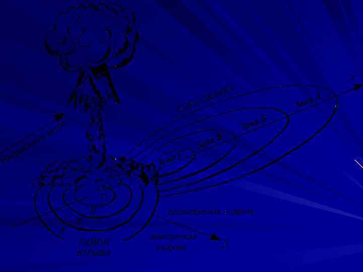 Очаг ядерного поражения – территория с находящимися на ней населением, строениями, техникой, животными, растениями, которая подверглась воздействию поражающих факторов ядерного оружия с образованием разрушений, пожаров и зон радиоактивного поражения. В результате радиоактивного заражения местности, последняя поражается неравномерно. По степени опасности зараженную местность по следу облака ядерного взрыва принято делить на 4 зоны: А – умеренного (А), Б – сильного (Б), В – опасного (В), Г – чрезвычайно опасного заражения (Г). Воображаемые границы между зонами представляют собой изолинии эллиптической формы, все точки каждой из которых характеризуются одинаковыми значениями мощности дозы.