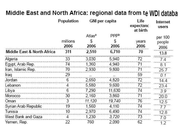 From 1980 to 2005 • The world now has 60% more people: 93% more urban and 36% more rural. • The MENA region's population has grown much faster, the corresponding rates being 100%, 142% and 58%. • The world economy has grown 3. 2 fold, whereas the MENA economy has grown 2. 2 fold. • The Gross National Income (GNI) per capita worldwide has grown 128%, whereas the growth in the MENA region has been merely 18%. • The CO 2 emissions of the MENA region have grown four times faster than the world average.