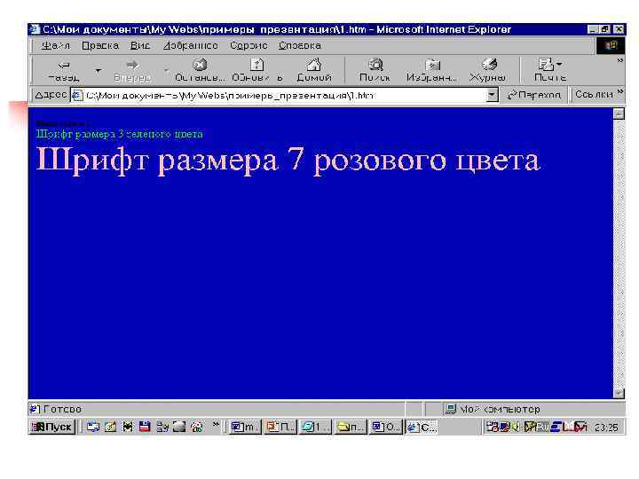 Пример использования цветового оформления <HTML> <HEAD> </HEAD> <BODY bgcolor="#RRGGBB"> <FONT size="1">Шрифт размера 1</FONT><BR> <FONT color="#00 FF 00">Шрифт размера 3 зеленого цвета</FONT><BR> <FONT size="+4" color="pink">Шрифт размера 7 розового цвета</FONT> </BODY> </HTML>