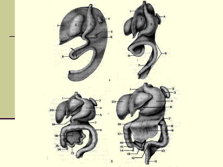 Из нее образуется полость рта и глотки Головная (глоточная) кишка Зачаток трахеи, легкого Зачаток печени и поджелудочной железы Передняя кишка из нее образуются желудок и пищевод Средняя кишка из нее образуются тонкая кишка, толстая (до нисходящей), печень, pancreas Задняя кишка Из нее образуются нисходящая, сигмовидная, прямая кишки Туловищная кишка
