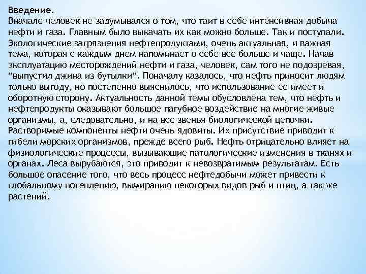 Введение. Вначале человек не задумывался о том, что таит в себе интенсивная добыча нефти и газа. Главным было выкачать их как можно больше. Так и поступали. Экологические загрязнения нефтепродуктами, очень актуальная, и важная тема, которая с каждым днем напоминает о себе все больше и чаще. Начав эксплуатацию месторождений нефти и газа, человек, сам того не подозревая, “выпустил джина из бутылки“. Поначалу казалось, что нефть приносит людям только выгоду, но постепенно выяснилось, что использование ее имеет и оборотную сторону. Актуальность данной темы обусловлена тем, что нефть и нефтепродукты оказывают большое пагубное воздействие на многие живые организмы, а, следовательно, и на все звенья биологической цепочки. Растворимые компоненты нефти очень ядовиты. Их присутствие приводит к гибели морских организмов, прежде всего рыб. Нефть отрицательно влияет на физиологические процессы, вызывающие патологические изменения в тканях и органах. Леса вырубаются, это приводит к невозвратимым результатам. Есть большое опасение того, что весь процесс нефтедобычи может привести к глобальному потеплению, вымиранию некоторых видов рыб и птиц, а так же растений.