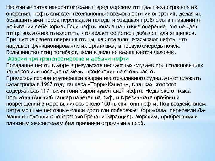 Нефтяные пятна наносят огромный вред морским птицам из-за строения их оперения, нефть снижает изоляционные возможности их оперения, делая их беззащитными перед перепадами погоды и создавая проблемы в плавании и добывании себе корма. Если нефть попала на птичье оперение, это не дает птице возможность взлететь, что делает ее легкой добычей для хищников. При чистке своего оперения птицы, как правило, всасывают нефть, что нарушает функционирование их организма, в первую очередь почек. Большинство птиц погибают, если в дело не вмешивается человек. Аварии при транспортировке и добычи нефти Попадание нефти в море в результате несчастных случаев при столкновениях танкеров или посадке на мель, происходит не столь часто. Примером первой крупнейшей аварии нефтеналивного судна может служить катастрофа в 1967 году танкера «Торри-Каньон» , в танках которого содержалось 117 тысяч тонн сырой кувейтской нефти. Недалеко от мыса Корнуолл (Англия) танкер налетел на риф, и в результате пробоин и повреждений в море вылилось около 100 тысяч тонн нефти. Под воздействием ветра мощные нефтяные слики достигли побережья Корнуолла, пересекли Ла. Манш и подошли к побережью Бретани (Франция). Морским, прибрежным и пляжным экосистемам был причинен огромный ущерб.