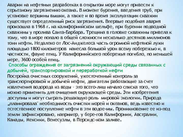 Аварии на нефтяных разработках в открытом море могут привести к серьезному загрязнению океана. В момент бурения, введения труб, при установке вершины вышки, а также и во время эксплуатации скважин существует определенный риск загрязнения. Впервые подобная авария произошла в 1968 г. на калифорнийском шельфе, при бурении подводной скважины у пролива Санта-Барбара. Трещина в головке скважины привела к тому, что в море попало в общей сложности несколько десятков миллионов тонн нефти. Недалеко от Лос-Анджелеса часть огромной нефтяной лужи площадью 1800 километров нанесла большой урон всему побережью и, в частности, фауне птиц. У Калифорнийского побережья погибло, по меньшей мере, 3600 особей птиц. Способы ограждения от загрязнений окружающий среды связанных с добычей, транспортировкой и переработкой нефти Постройка очистных сооружений, ужесточенный контроль за транспортировкой и добычей нефти, двигатели работающие за счет извлечения водорода из воды – это всего-лиш начало списка того, что можно применить для очищения окружающей среды. Эти изобретения доступны и могут сыграть решающую роль мировой экологии. Природа „планировала" необходимость очистки морей и океанов, ведь известно и естественное поступление нефти в эти водое мы. Проникновение ее из-под земли зафиксировано, например, у бере гов Калифорнии, Австралии, Канады, Мексики, Венесуэлы, в Персидс ком заливе.