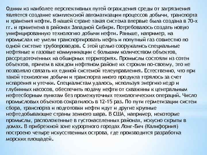 Одним из наиболее перспективных путей ограждения среды от загрязнения является создание комплексной автоматизации процессов добычи, транспорта и хранения нефти. В нашей стране такая система впервые была создана в 70 -х гг. и применена в районах Западной Сибири. Потребовалось создать новую унифицированную технологию добычи нефти. Раньше, например, на промыслах не умели транспортировать нефть и попутный газ совместно по одной системе трубопроводов. С этой целью сооружались специальные нефтяные и газовые коммуникации с большим количеством объектов, рассредоточенных на обширных территориях. Промыслы состояли из сотен объектов, причем в каждом нефтяном районе их строили по-своему, это не позволяло связать их единой системой телеуправления. Естественно, что при такой технологии добычи и транспорта много продукта терялось за счет испарения и утечки. Специалистам удалось, используя энергию недр и глубинных насосов, обеспечить подачу нефти от скважины к центральным нефтесборным пунктам без промежуточных технологических операций. Число промысловых объектов сократилось в 12 -15 раз. По пути герметизации систем сбора, транспорта и подготовки нефти идут и другие крупные нефтедобывающие страны земного шара. В США, например, некоторые промыслы, расположенные в густонаселенных районах, искусно скрыты в домах. В прибрежной зоне курортного городах Лонг-Бич (Калифорния) построено четыре искусственных острова, где производится разработка морских площадей.