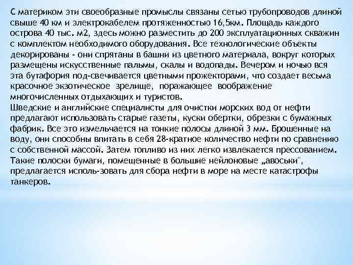 С материком эти своеобразные промыслы связаны сетью трубопроводов длиной свыше 40 км и электрокабелем протяженностью 16, 5 км. Площадь каждого острова 40 тыс. м 2, здесь можно разместить до 200 эксплуатационных скважин с комплектом необходимого оборудования. Все технологические объекты декорированы - они спрятаны в башни из цветного материала, вокруг которых размещены искусственные пальмы, скалы и водопады. Вечером и ночью вся эта бутафория под свечивается цветными прожекторами, что создает весьма красочное экзотическое зрелище, поражающее воображение многочисленных отдыхающих и туристов. Шведские и английские специалисты для очистки морских вод от нефти предлагают использовать старые газеты, куски обертки, обрезки с бумажных фабрик. Все это измельчается на тонкие полосы длиной 3 мм. Брошенные на воду, они способны впитать в себя 28 -кратное количество нефти по сравнению с собственной массой. Затем топливо из них легко извлекается прессованием. Такие полоски бумаги, помещенные в большие нейлоновые „авоськи", предлагается исполь зовать для сбора нефти в море на месте катастрофы танкеров.