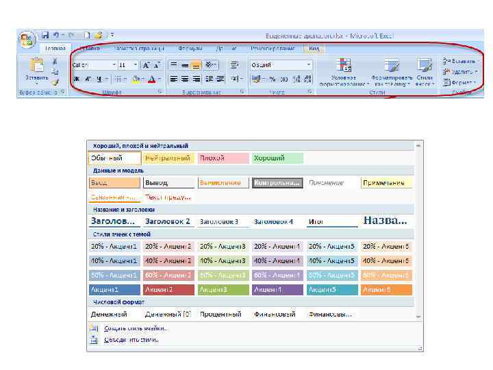 Шрифт Изменяет шрифт, начертание, размер, цвет, подчеркивание и эффекты текста в выделенных ячейках