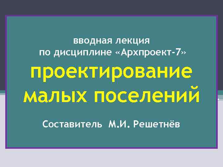 вводная лекция по дисциплине «Архпроект-7» проектирование малых поселений Составитель М. И. Решетнёв