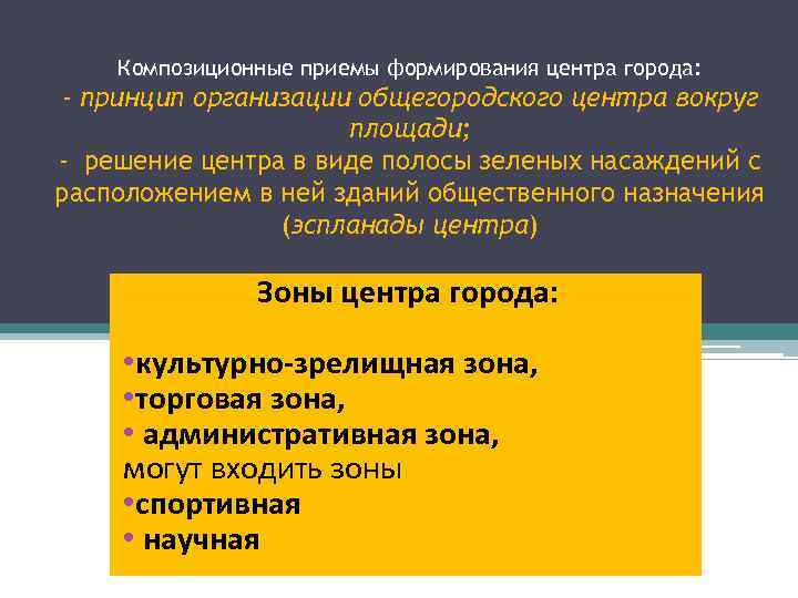 Композиционные приемы формирования центра города: - принцип организации общегородского центра вокруг площади; - решение центра в виде полосы зеленых насаждений с расположением в ней зданий общественного назначения (эспланады центра) Зоны центра города: • культурно-зрелищная зона, • торговая зона, • административная зона, могут входить зоны • спортивная • научная