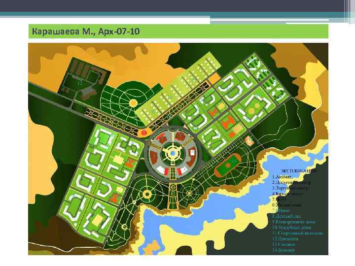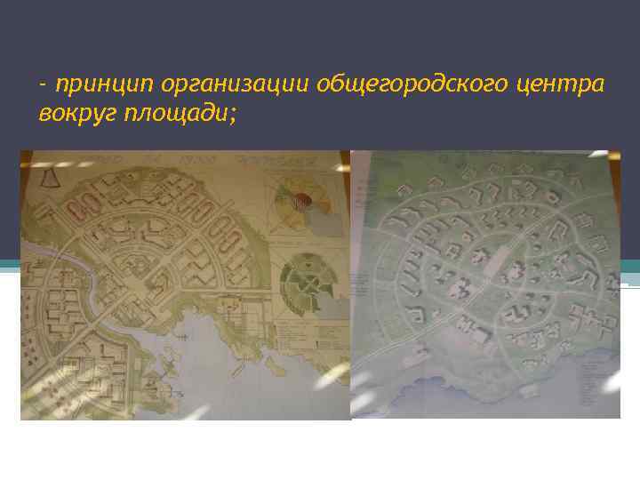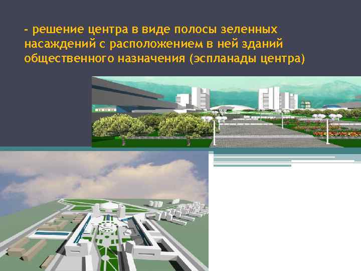 - решение центра в виде полосы зеленных насаждений с расположением в ней зданий общественного назначения (эспланады центра)