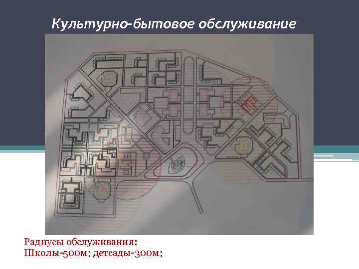 Культурно-бытовое обслуживание Радиусы обслуживания: Школы-500 м; детсады-300 м;
