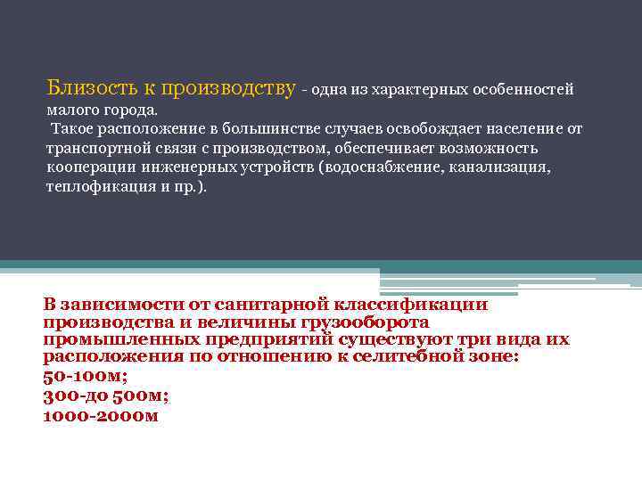Близость к производству - одна из характерных особенностей малого города. Такое расположение в большинстве случаев освобождает население от транспортной связи с производством, обеспечивает возможность кооперации инженерных устройств (водоснабжение, канализация, теплофикация и пр. ). В зависимости от санитарной классификации производства и величины грузооборота промышленных предприятий существуют три вида их расположения по отношению к селитебной зоне: 50 -100 м; 300 -до 500 м; 1000 -2000 м