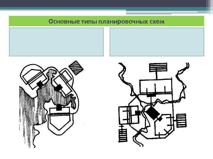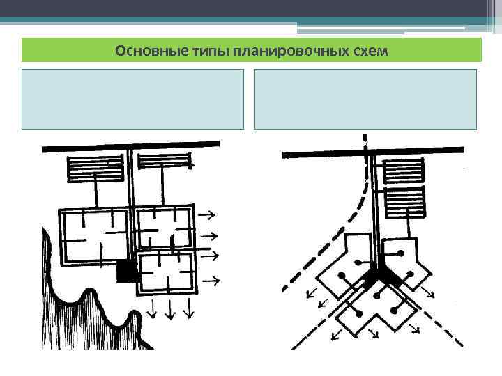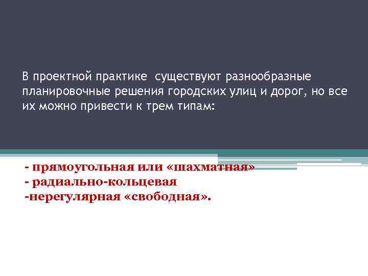 В проектной практике существуют разнообразные планировочные решения городских улиц и дорог, но все их можно привести к трем типам: - прямоугольная или «шахматная» - радиально-кольцевая -нерегулярная «свободная» .