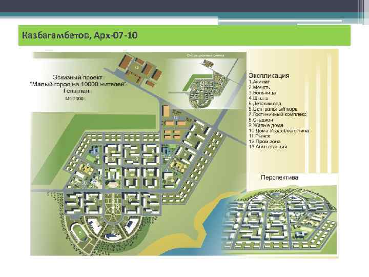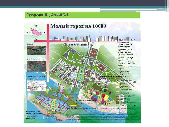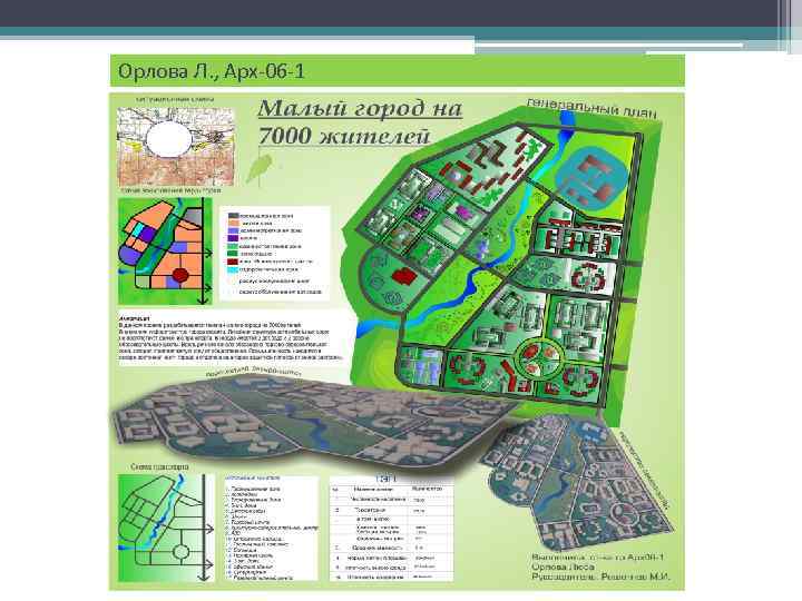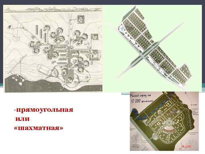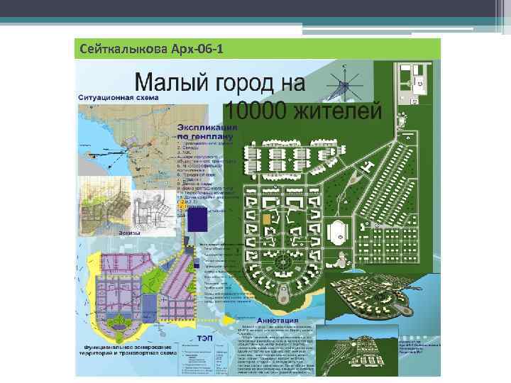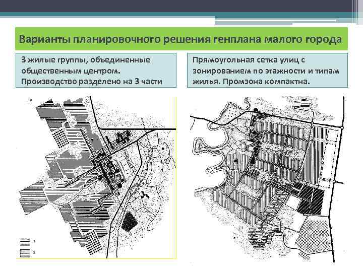 Варианты планировочного решения генплана малого города 3 жилые группы, объединенные общественным центром. Производство разделено на 3 части Прямоугольная сетка улиц с зонированием по этажности и типам жилья. Промзона компактна.