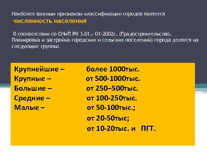 Наиболее важным признаком классификации городов является численность населения В соответствии со СНи. П РК 3. 01. - 01 -2002 г. (Градостроительство. Планировка и застройка городских и сельских поселений) города делятся на следующие группы: Крупнейшие – Крупные – Большие – Средние – Малые – более 1000 тыс. от 500 -1000 тыс. от 250– 500 тыс. от 100 -250 тыс. от 50 -100 тыс. ; от 20 -50 тыс; от 10 -20 тыс. и ПГТ.