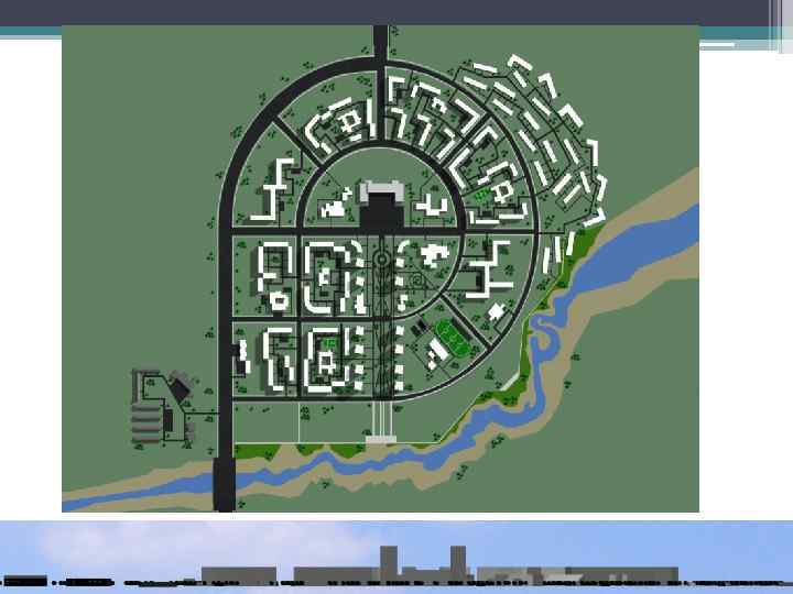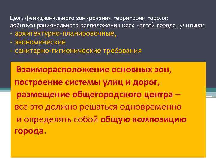 Цель функционального зонирования территории города: добиться рационального расположения всех частей города, учитывая - архитектурно-планировочные, - экономические - санитарно-гигиенические требования Взаиморасположение основных зон, построение системы улиц и дорог, размещение общегородского центра – все это должно решаться одновременно и определять собой общую композицию города.