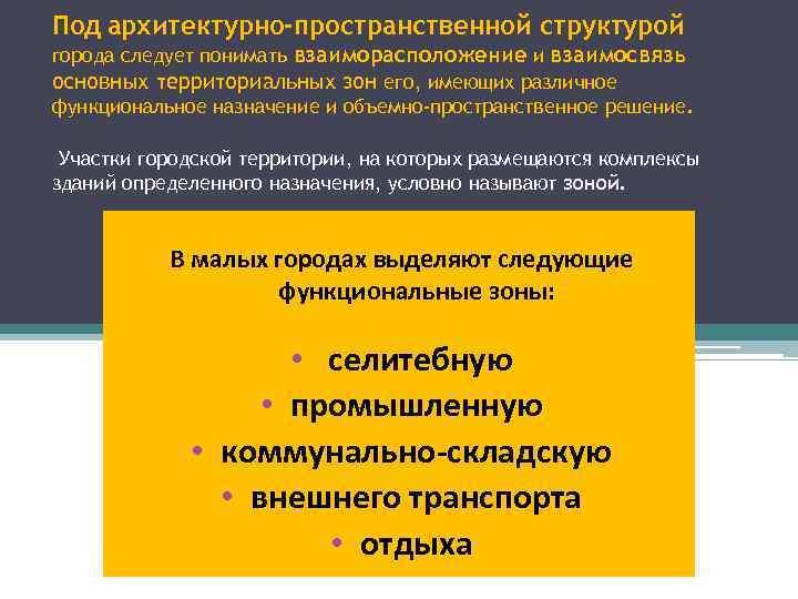Под архитектурно-пространственной структурой города следует понимать взаиморасположение и взаимосвязь основных территориальных зон его, имеющих различное функциональное назначение и объемно-пространственное решение. Участки городской территории, на которых размещаются комплексы зданий определенного назначения, условно называют зоной. В малых городах выделяют следующие функциональные зоны: • селитебную • промышленную • коммунально-складскую • внешнего транспорта • отдыха
