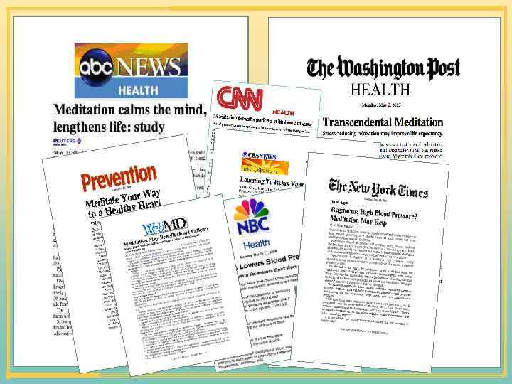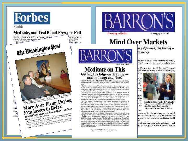 Открытие четвертого состояния сознания • Снижение частоты дыхания – состояние глубокого покоя • Снижение уровня лактата в плазме • Значительное увеличение электрического сопротивления кожи • ЭЭГ: бодрствование в покое Scientific American 1972; 226: 84 -90; Science 1970; 167: 1751 -1754 • Снижение кортизола в плазме • Увеличение мышечной релаксации • Естественная приостановка дыхания • Увеличение кровотока, направленного к мозгу • Когерентность ЭЭГ: целостная работа мозга American Journal of Physiology 235: R 89–R 92, 1978; International Journal of Neuroscience 14: 147– 151, 1981; Hormones and Behavior 10: 54– 60, 1978; Journal of Applied Physiology 56: 607– 612, 1984; Physiology & Behavior 35: 591– 595, 1985
