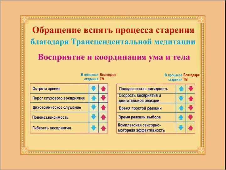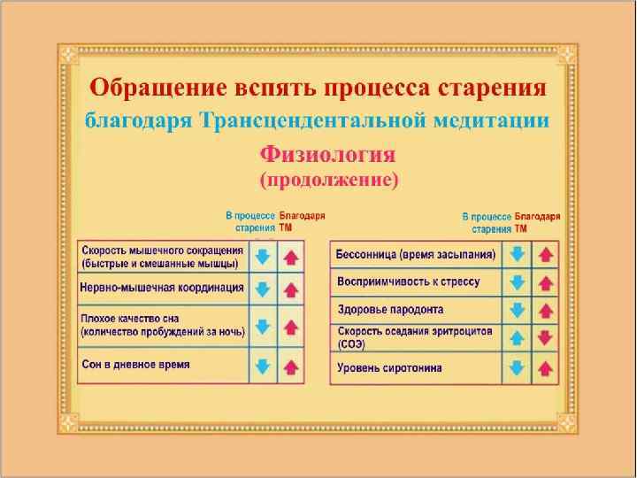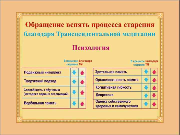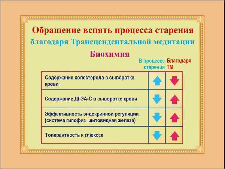 Люди, регулярно занимавшиеся по программе Трансцендентальной медитации, показали более молодой биологический возраст, при этом чем дольше они занимались по программе, тем большим было сокращение биологического возраста. Источник: International Journal of Neuroscience 16: 53– 58, 1982.