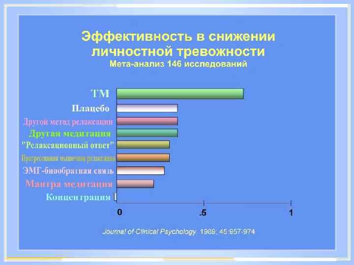 Улучшение социального поведения Результаты научных исследований: • Снижение потребления алкоголя Alcoholism Treatment Quarterly • Рост удовлетворенности работой Academy of Management Journal • Улучшение исполнения трудовых обязанностей Academy of Management Journal • Развитие лидерских качеств Career Development International • Снижение потребления наркотиков International Journal of the Addictions • Большее уважение к другим Perceptual and Motor Skills