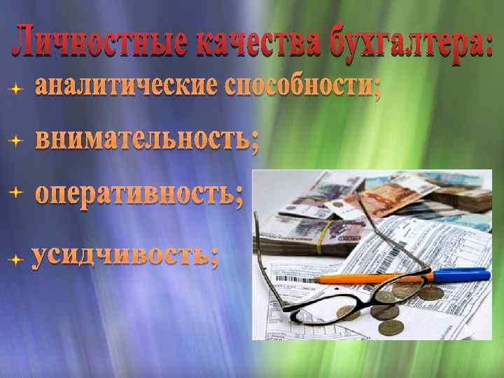 Ответственный и организованный человек, ведь бухгалтер просто не имеет права забывать или терять документы. Необходимо обладать математическими способностями и логическим мышлением, поскольку придется постоянно иметь дело с цифрами, и ошибка тут дорогого стоит – в прямом смысле.