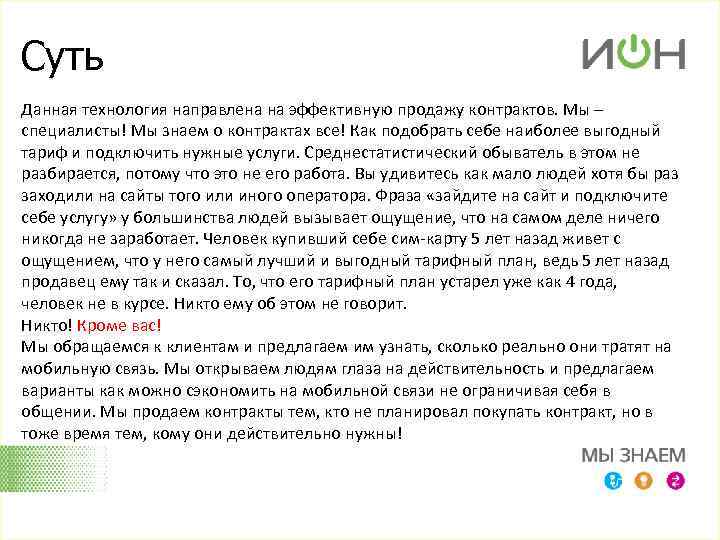 Суть Данная технология направлена на эффективную продажу контрактов. Мы – специалисты! Мы знаем о контрактах все! Как подобрать себе наиболее выгодный тариф и подключить нужные услуги. Среднестатистический обыватель в этом не разбирается, потому что это не его работа. Вы удивитесь как мало людей хотя бы раз заходили на сайты того или иного оператора. Фраза «зайдите на сайт и подключите себе услугу» у большинства людей вызывает ощущение, что на самом деле ничего никогда не заработает. Человек купивший себе сим-карту 5 лет назад живет с ощущением, что у него самый лучший и выгодный тарифный план, ведь 5 лет назад продавец ему так и сказал. То, что его тарифный план устарел уже как 4 года, человек не в курсе. Никто ему об этом не говорит. Никто! Кроме вас! Мы обращаемся к клиентам и предлагаем им узнать, сколько реально они тратят на мобильную связь. Мы открываем людям глаза на действительность и предлагаем варианты как можно сэкономить на мобильной связи не ограничивая себя в общении. Мы продаем контракты тем, кто не планировал покупать контракт, но в тоже время тем, кому они действительно нужны!
