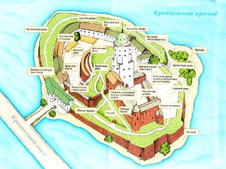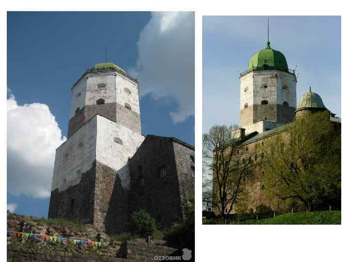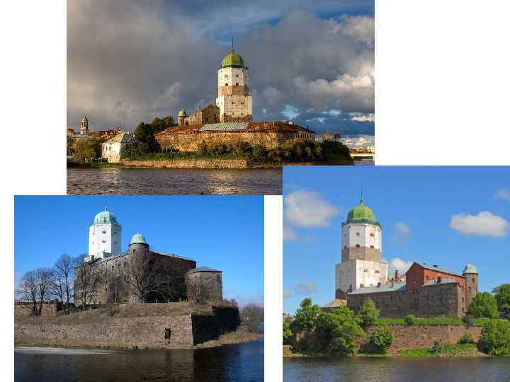 Выборг – крепость у залива, святая крепость. Выборгский замок в 13 в. - сооружение из мощной прямоугольной башни и оборонительной стены, повторяющий профиль холма. Толщина стен у основания 1, 6 – 2 метра, башни 4, 5 м. главная башня – донжон – самая ранняя из каменных построек на острове. До 16 в – четырехугольная.