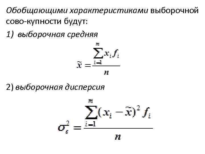Обобщающими характеристиками выборочной сово купности будут: 1) выборочная средняя 2) выборочная дисперсия