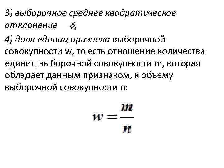 3) выборочное среднее квадратическое отклонение ; 4) доля единиц признака выборочной совокупности w, то есть отношение количества единиц выборочной совокупности m, которая обладает данным признаком, к объему выборочной совокупности n: