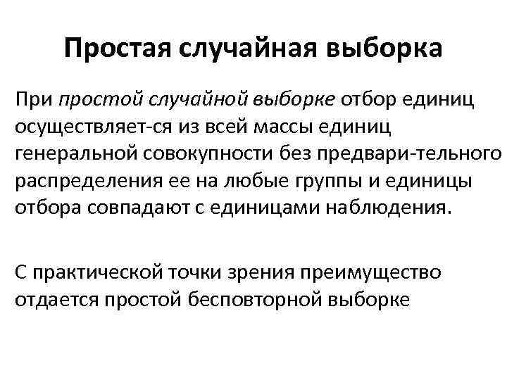 Простая случайная выборка При простой случайной выборке отбор единиц осуществляет ся из всей массы единиц генеральной совокупности без предвари тельного распределения ее на любые группы и единицы отбора совпадают с единицами наблюдения. С практической точки зрения преимущество отдается простой бесповторной выборке