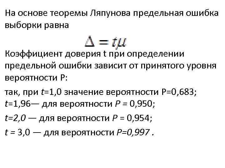На основе теоремы Ляпунова предельная ошибка выборки равна Коэффициент доверия t при определении предельной ошибки зависит от принятого уровня вероятности Р: так, при t=1, 0 значение вероятности Р=0, 683; t=1, 96— для вероятности Р = 0, 950; t=2, 0 — для вероятности Р = 0, 954; t = 3, 0 — для вероятности Р=0, 997.