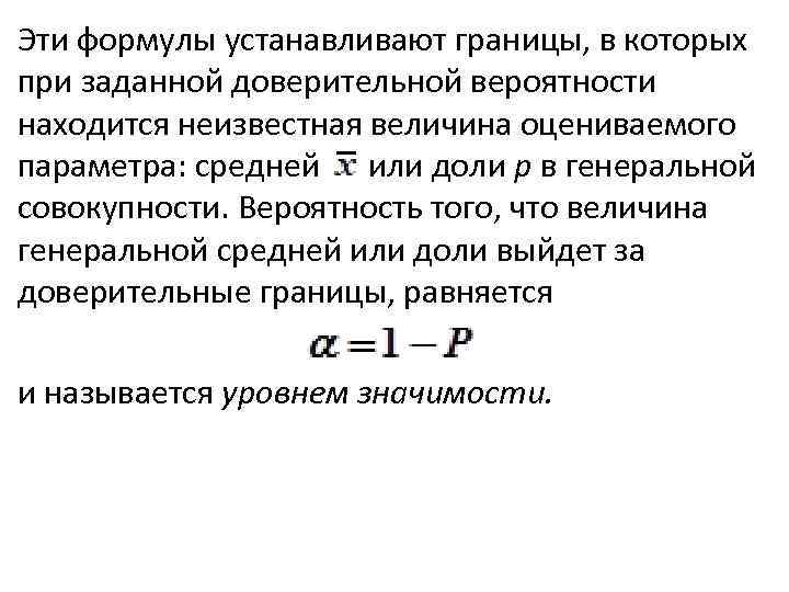 Эти формулы устанавливают границы, в которых при заданной доверительной вероятности находится неизвестная величина оцениваемого параметра: средней или доли р в генеральной совокупности. Вероятность того, что величина генеральной средней или доли выйдет за доверительные границы, равняется и называется уровнем значимости.