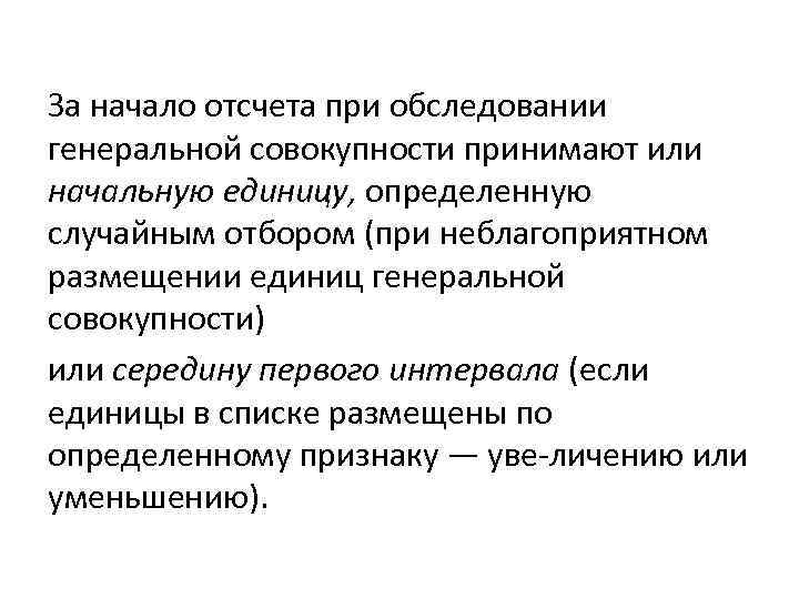 За начало отсчета при обследовании генеральной совокупности принимают или начальную единицу, определенную случайным отбором (при неблагоприятном размещении единиц генеральной совокупности) или середину первого интервала (если единицы в списке размещены по определенному признаку — уве личению или уменьшению).