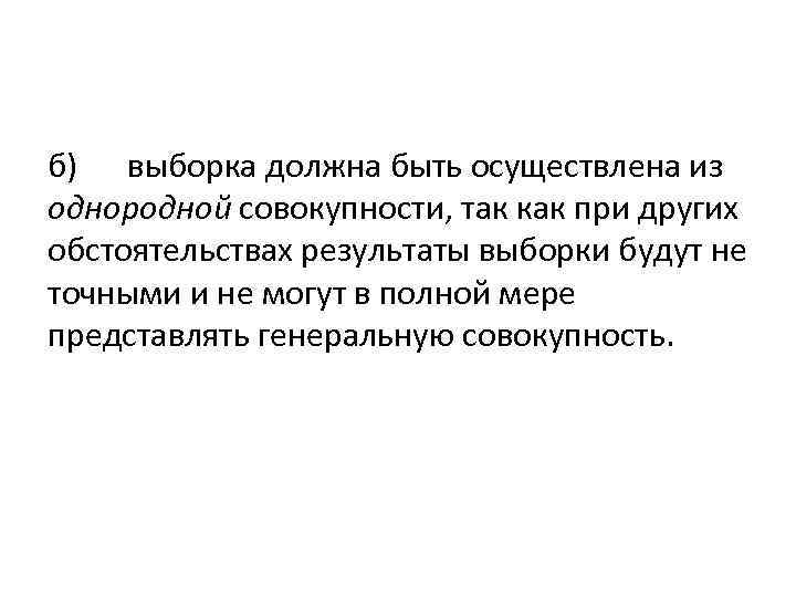 б) выборка должна быть осуществлена из однородной совокупности, так как при других обстоятельствах результаты выборки будут не точными и не могут в полной мере представлять генеральную совокупность.