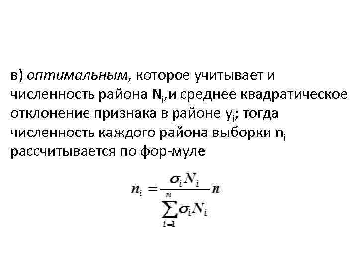 в) оптимальным, которое учитывает и численность района Ni, и среднее квадратическое отклонение признака в районе yi; тогда численность каждого района выборки ni рассчитывается по фор муле :