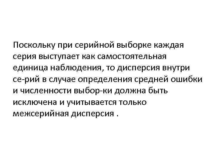 Поскольку при серийной выборке каждая серия выступает как самостоятельная единица наблюдения, то дисперсия внутри се рий в случае определения средней ошибки и численности выбор ки должна быть исключена и учитывается только межсерийная дисперсия.
