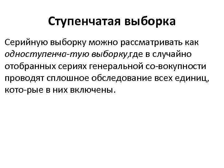 Ступенчатая выборка Серийную выборку можно рассматривать как одноступенча тую выборку, где в случайно отобранных сериях генеральной со вокупности проводят сплошное обследование всех единиц, кото рые в них включены.