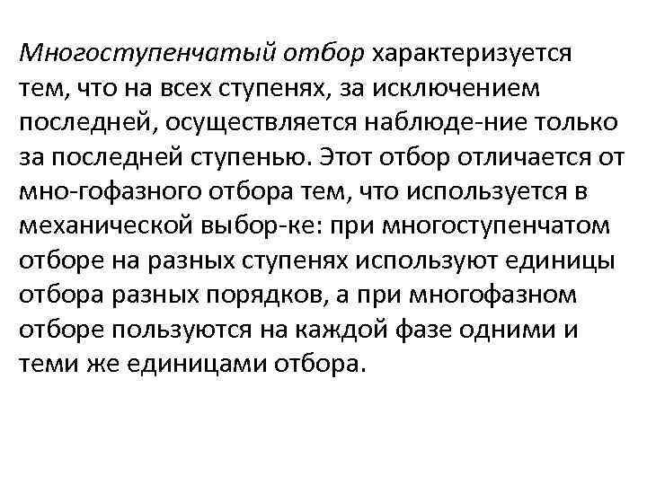 Многоступенчатый отбор характеризуется тем, что на всех ступенях, за исключением последней, осуществляется наблюде ние только за последней ступенью. Этот отбор отличается от мно гофазного отбора тем, что используется в механической выбор ке: при многоступенчатом отборе на разных ступенях используют единицы отбора разных порядков, а при многофазном отборе пользуются на каждой фазе одними и теми же единицами отбора.