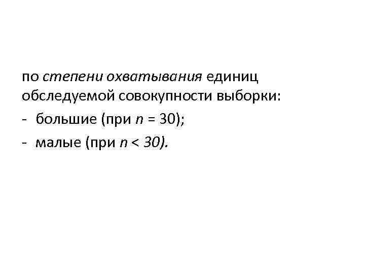 по степени охватывания единиц обследуемой совокупности выборки: большие (при n = 30); малые (при n < 30).