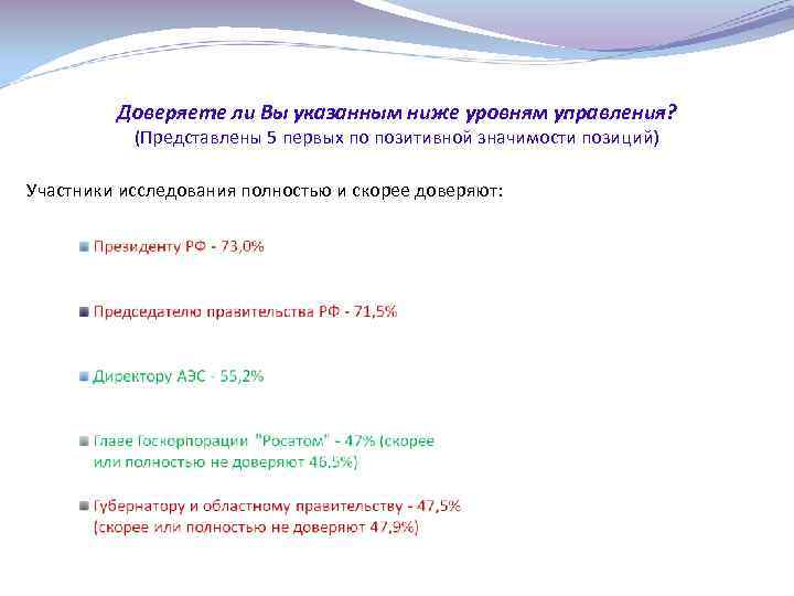 Доверяете ли Вы указанным ниже уровням управления? (Представлены 5 первых по позитивной значимости позиций) Участники исследования полностью и скорее доверяют: