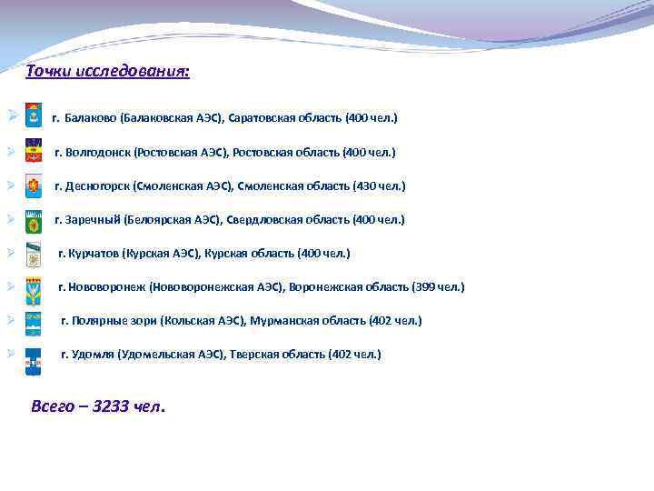 Точки исследования: Ø Точки исследования: г. Балаково (Балаковская АЭС), Саратовская область (400 чел. ) Ø г. Волгодонск (Ростовская АЭС), Ростовская область (400 чел. ) Ø г. Десногорск (Смоленская АЭС), Смоленская область (430 чел. ) Ø г. Заречный (Белоярская АЭС), Свердловская область (400 чел. ) Ø г. Курчатов (Курская АЭС), Курская область (400 чел. ) Ø г. Нововоронеж (Нововоронежская АЭС), Воронежская область (399 чел. ) Ø г. Полярные зори (Кольская АЭС), Мурманская область (402 чел. ) Ø г. Удомля (Удомельская АЭС), Тверская область (402 чел. ) Всего – 3233 чел.