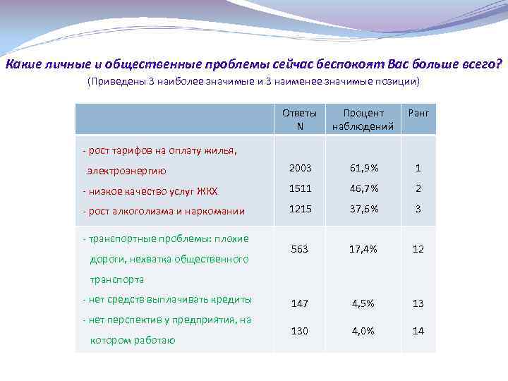 Какие личные и общественные проблемы сейчас беспокоят Вас больше всего? (Приведены 3 наиболее значимые и 3 наименее значимые позиции) Ответы N Процент наблюдений Ранг 2003 61, 9% 1 - низкое качество услуг ЖКХ 1511 46, 7% 2 - рост алкоголизма и наркомании 1215 37, 6% 3 563 17, 4% 12 147 4, 5% 13 130 4, 0% 14 - рост тарифов на оплату жилья, электроэнергию - транспортные проблемы: плохие дороги, нехватка общественного транспорта - нет средств выплачивать кредиты - нет перспектив у предприятия, на котором работаю