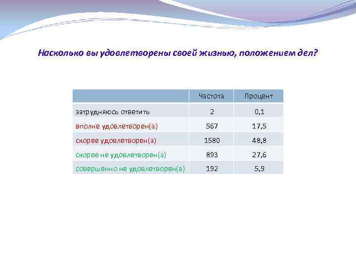 Насколько вы удовлетворены своей жизнью, положением дел? Частота Процент 2 0, 1 вполне удовлетворен(а) 567 17, 5 скорее удовлетворен(а) 1580 48, 8 скорее не удовлетворен(а) 893 27, 6 совершенно не удовлетворен(а) 192 5, 9 затрудняюсь ответить