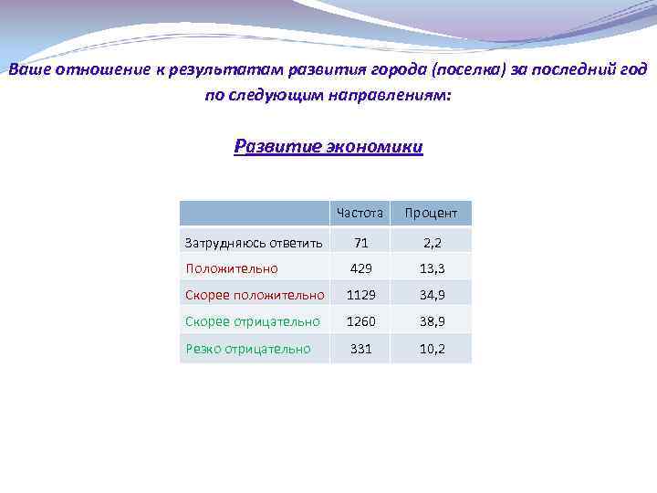 Ваше отношение к результатам развития города (поселка) за последний год по следующим направлениям: Развитие экономики Частота Процент Затрудняюсь ответить 71 2, 2 Положительно 429 13, 3 Скорее положительно 1129 34, 9 Скорее отрицательно 1260 38, 9 Резко отрицательно 331 10, 2
