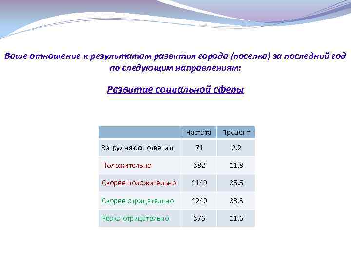Ваше отношение к результатам развития города (поселка) за последний год по следующим направлениям: Развитие социальной сферы Частота Процент Затрудняюсь ответить 71 2, 2 Положительно 382 11, 8 Скорее положительно 1149 35, 5 Скорее отрицательно 1240 38, 3 Резко отрицательно 376 11, 6