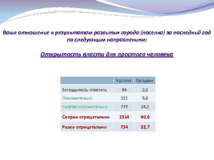 Ваше отношение к результатам развития города (поселка) за последний год по следующим направлениям: Открытость власти для простого человека Частота Процент Затрудняюсь ответить 84 2, 6 Положительно 311 9, 6 Скорее положительно 779 24, 1 Скорее отрицательно 1314 40, 6 Резко отрицательно 734 22, 7
