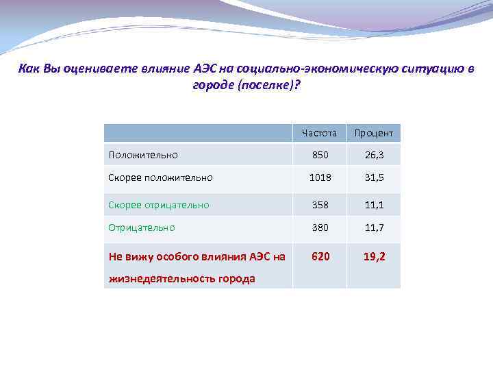 Как Вы оцениваете влияние АЭС на социально-экономическую ситуацию в городе (поселке)? Частота Процент Положительно 850 26, 3 Скорее положительно 1018 31, 5 Скорее отрицательно 358 11, 1 Отрицательно 380 11, 7 Не вижу особого влияния АЭС на 620 19, 2 жизнедеятельность города