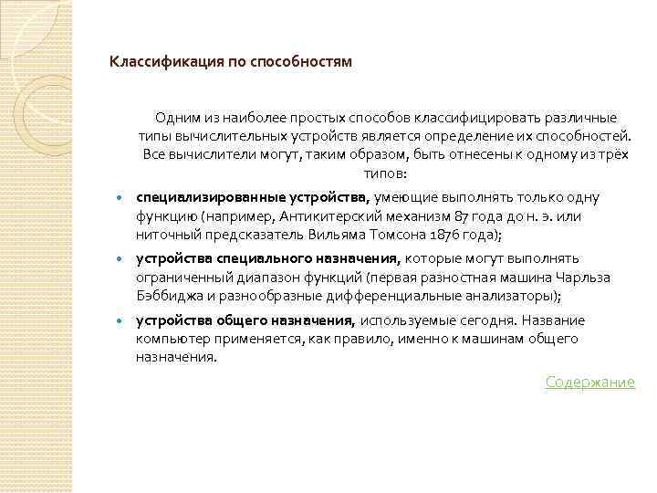 Классификация по способностям Одним из наиболее простых способов классифицировать различные типы вычислительных устройств является определение их способностей. Все вычислители могут, таким образом, быть отнесены к одному из трёх типов: специализированные устройства, умеющие выполнять только одну функцию (например, Антикитерский механизм 87 года до н. э. или ниточный предсказатель Вильяма Томсона 1876 года); устройства специального назначения, которые могут выполнять ограниченный диапазон функций (первая разностная машина Чарльза Бэббиджа и разнообразные дифференциальные анализаторы); устройства общего назначения, используемые сегодня. Название компьютер применяется, как правило, именно к машинам общего назначения. Содержание