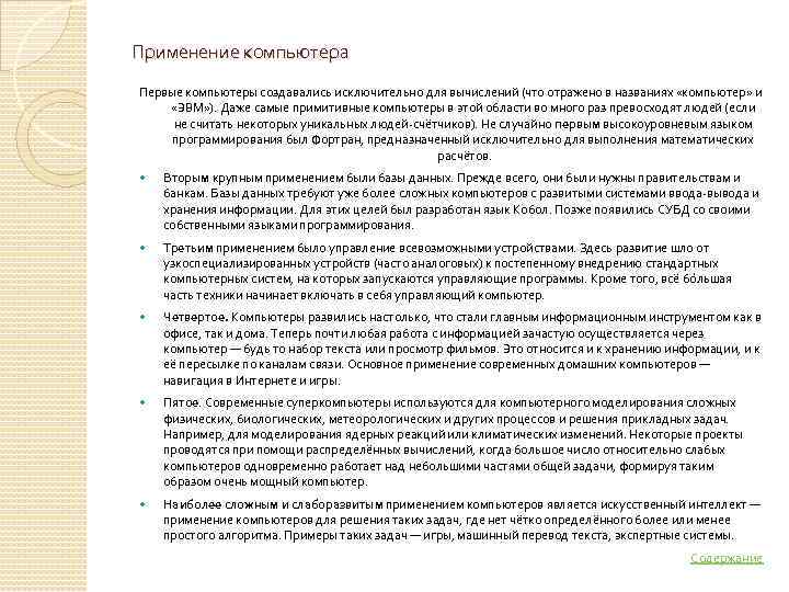 Применение компьютера Первые компьютеры создавались исключительно для вычислений (что отражено в названиях «компьютер» и «ЭВМ» ). Даже самые примитивные компьютеры в этой области во много раз превосходят людей (если не считать некоторых уникальных людей-счётчиков). Не случайно первым высокоуровневым языком программирования был Фортран, предназначенный исключительно для выполнения математических расчётов. Вторым крупным применением были базы данных. Прежде всего, они были нужны правительствам и банкам. Базы данных требуют уже более сложных компьютеров с развитыми системами ввода-вывода и хранения информации. Для этих целей был разработан язык Кобол. Позже появились СУБД со своими собственными языками программирования. Третьим применением было управление всевозможными устройствами. Здесь развитие шло от узкоспециализированных устройств (часто аналоговых) к постепенному внедрению стандартных компьютерных систем, на которых запускаются управляющие программы. Кроме того, всё бо льшая часть техники начинает включать в себя управляющий компьютер. Четвертое. Компьютеры развились настолько, что стали главным информационным инструментом как в офисе, так и дома. Теперь почти любая работа с информацией зачастую осуществляется через компьютер — будь то набор текста или просмотр фильмов. Это относится и к хранению информации, и к её пересылке по каналам связи. Основное применение современных домашних компьютеров — навигация в Интернете и игры. Пятое. Современные суперкомпьютеры используются для компьютерного моделирования сложных физических, биологических, метеорологических и других процессов и решения прикладных задач. Например, для моделирования ядерных реакций или климатических изменений. Некоторые проекты проводятся при помощи распределённых вычислений, когда большое число относительно слабых компьютеров одновременно работает над небольшими частями общей задачи, формируя таким образом очень мощный компьютер. Наиболее сложным и слаборазвитым применением компьютеров является искусственный интеллект — применение компьютеров для решения таких задач, где нет чётко определённого более или менее простого алгоритма. Примеры таких задач — игры, машинный перевод текста, экспертные системы. Содержание