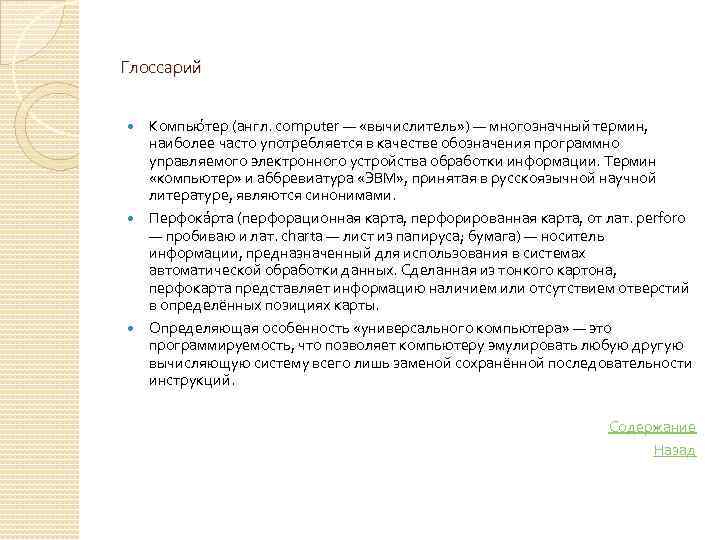 Глоссарий Компью тер (англ. computer — «вычислитель» ) — многозначный термин, наиболее часто употребляется в качестве обозначения программно управляемого электронного устройства обработки информации. Термин «компьютер» и аббревиатура «ЭВМ» , принятая в русскоязычной научной литературе, являются синонимами. Перфока рта (перфорационная карта, перфорированная карта, от лат. perforo — пробиваю и лат. charta — лист из папируса; бумага) — носитель информации, предназначенный для использования в системах автоматической обработки данных. Сделанная из тонкого картона, перфокарта представляет информацию наличием или отсутствием отверстий в определённых позициях карты. Определяющая особенность «универсального компьютера» — это программируемость, что позволяет компьютеру эмулировать любую другую вычисляющую систему всего лишь заменой сохранённой последовательности инструкций. Содержание Назад